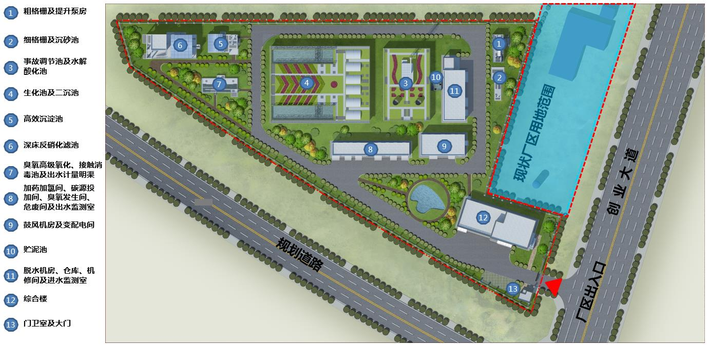 该项目位于金堂县竹篙农产品精深加工园区,项目新建总建筑面积65198㎡的竹篙中学;新建总建筑面积8143.55㎡的竹篙客运中心;新建占地面积13147㎡、处理规模6000m?/d的竹篙污水处理厂及相关配套设施,其中竹篙镇污水处理厂主体生化处理工艺采用“五段巴顿甫+BBR 生化池”工艺,深度处理采用“高效沉淀池+深床反硝化滤池+臭氧氧化”的三级深度处理工艺,总用地面积为1.29 万㎡主要服务于竹篙农产品精深加工园区的工业污水和生活污水。