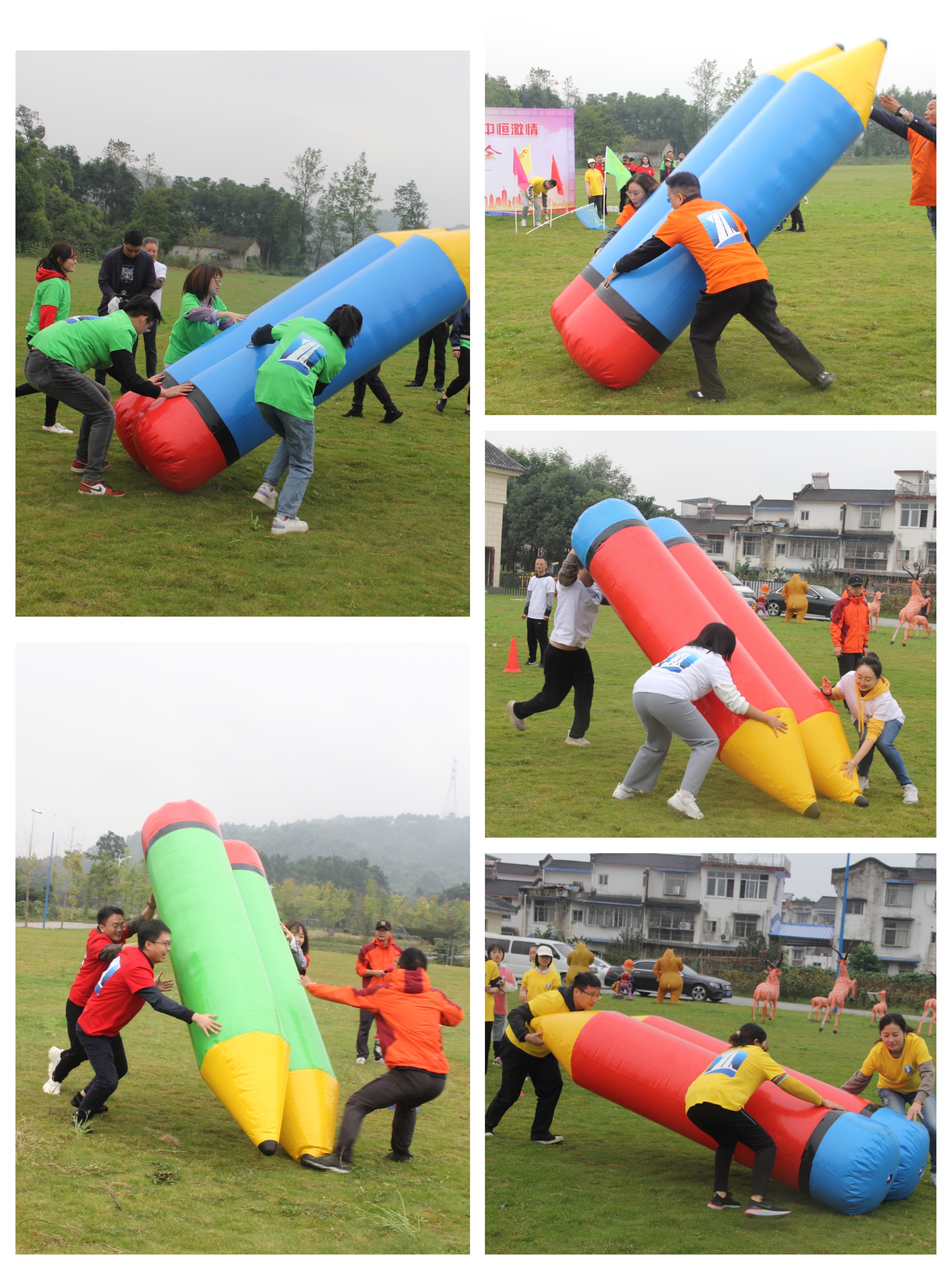 团队成员三人一组,同时向前翻滚充气铅笔,最快抵达终点的团队获胜。