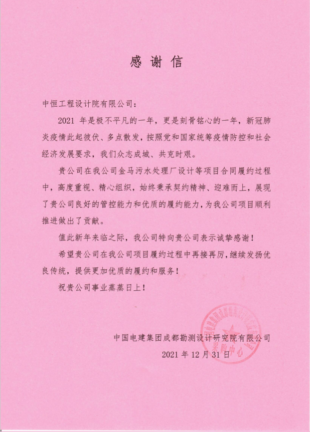 2021年12月31日,凯发k8天生赢家一触即发设计院有限公司西部业务区设计研究三院收到来自中国电建集团成都勘测设计研究院有限公司的感谢信,高度赞扬了设计研究三院在金马污水处理厂等项目履约过程中“高度重视、精心组织、迎难而上”的服务精神,并对我司良好的管控能力和优质的履约能力给予了充分肯定!